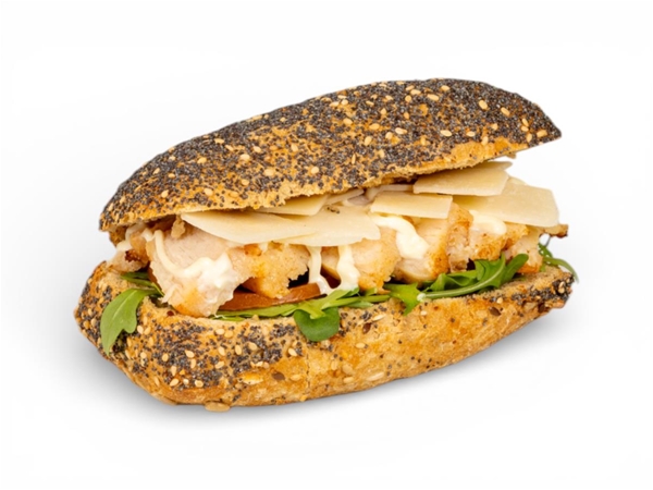 ‘t begint hier bij ‘t deeg! En dan beleggen we het broodje met heerlijke warme kip, tomaat, komkommer, rucola, mayonaise en parmezaanse kaas.